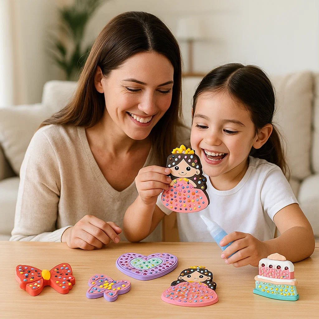 DIY-sættet giver en afslappende aktivitet, der hjælper børn med at falde til ro og samtidig styrke deres færdigheder. Perfekt til regnvejrsdage, kreative eftermiddage eller små pauser fra hverdagen – og ideelt til forældre, der ønsker et positivt og lærerigt krea-projekt.
